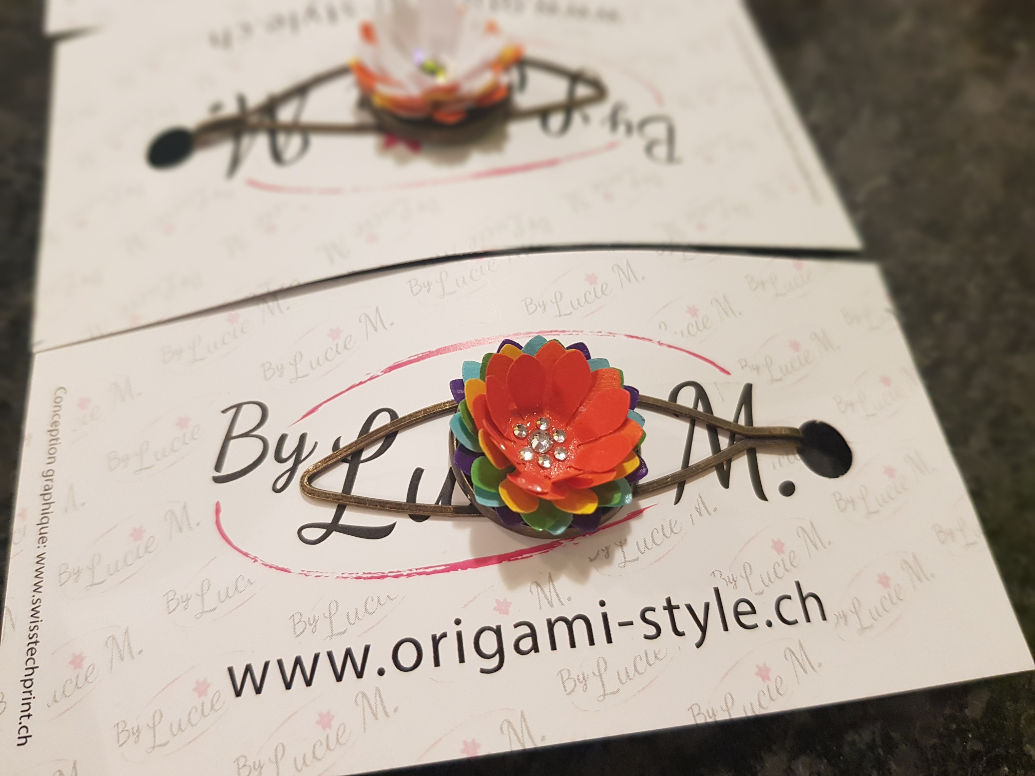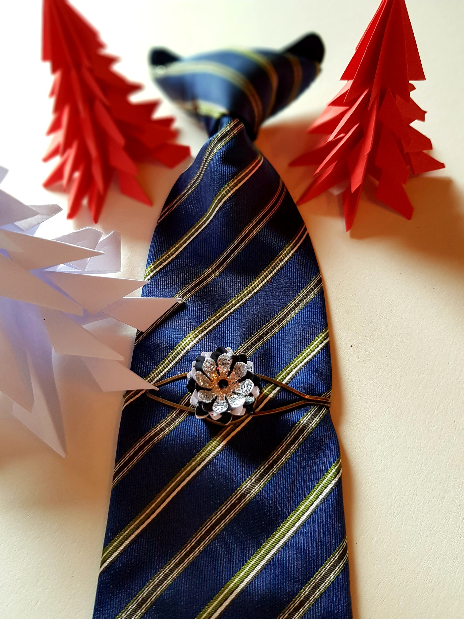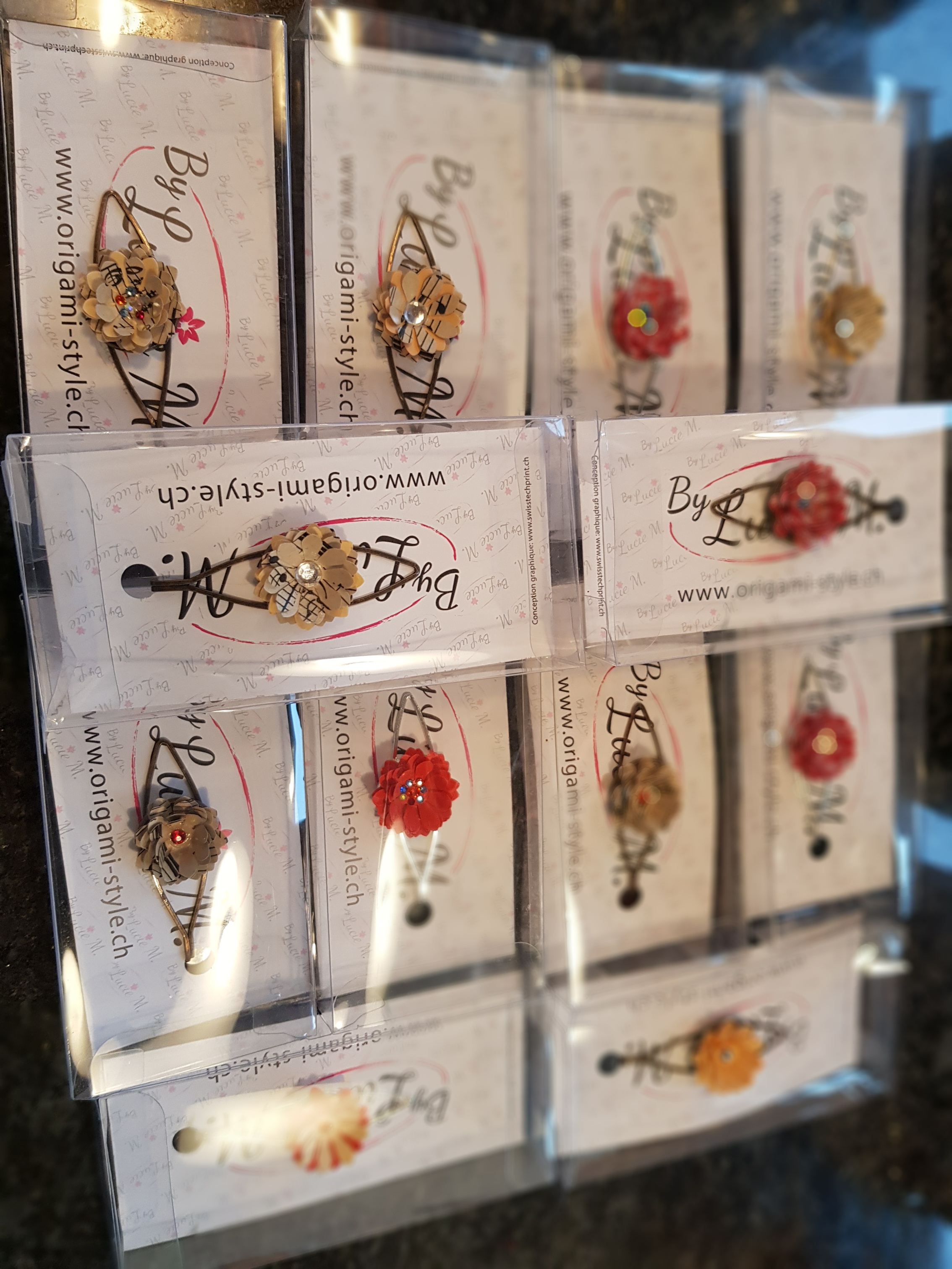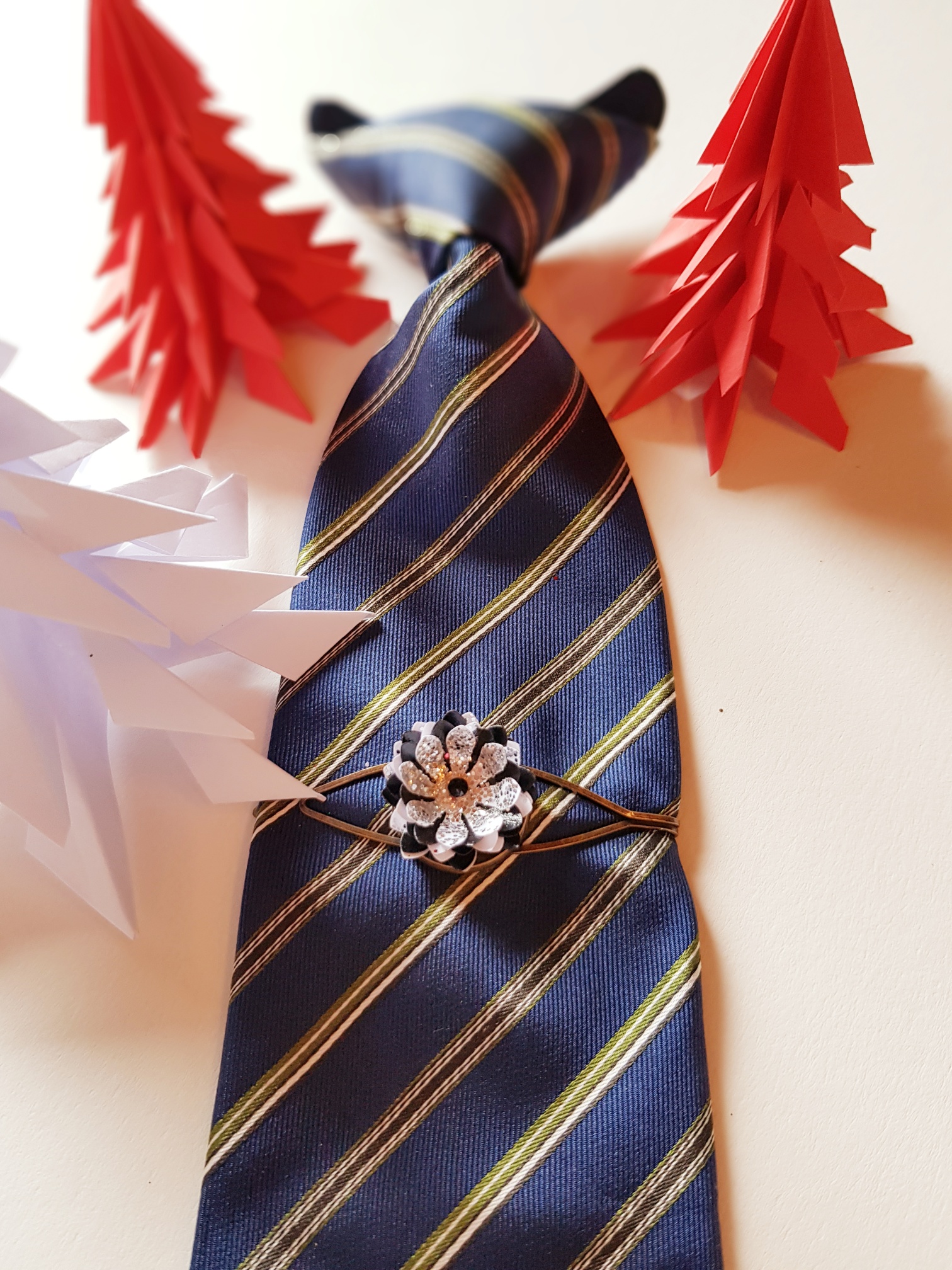 Pinces à cravate en papier recyclé, vous pouvez les utiliser aussi comme pinces à cheveux ou sur un foulard en bronze ou en métal.Vous avez la possibilité de personnaliser avec votre LogoTarifs 11.80.-CHF pce + frais de port 7.-CHF